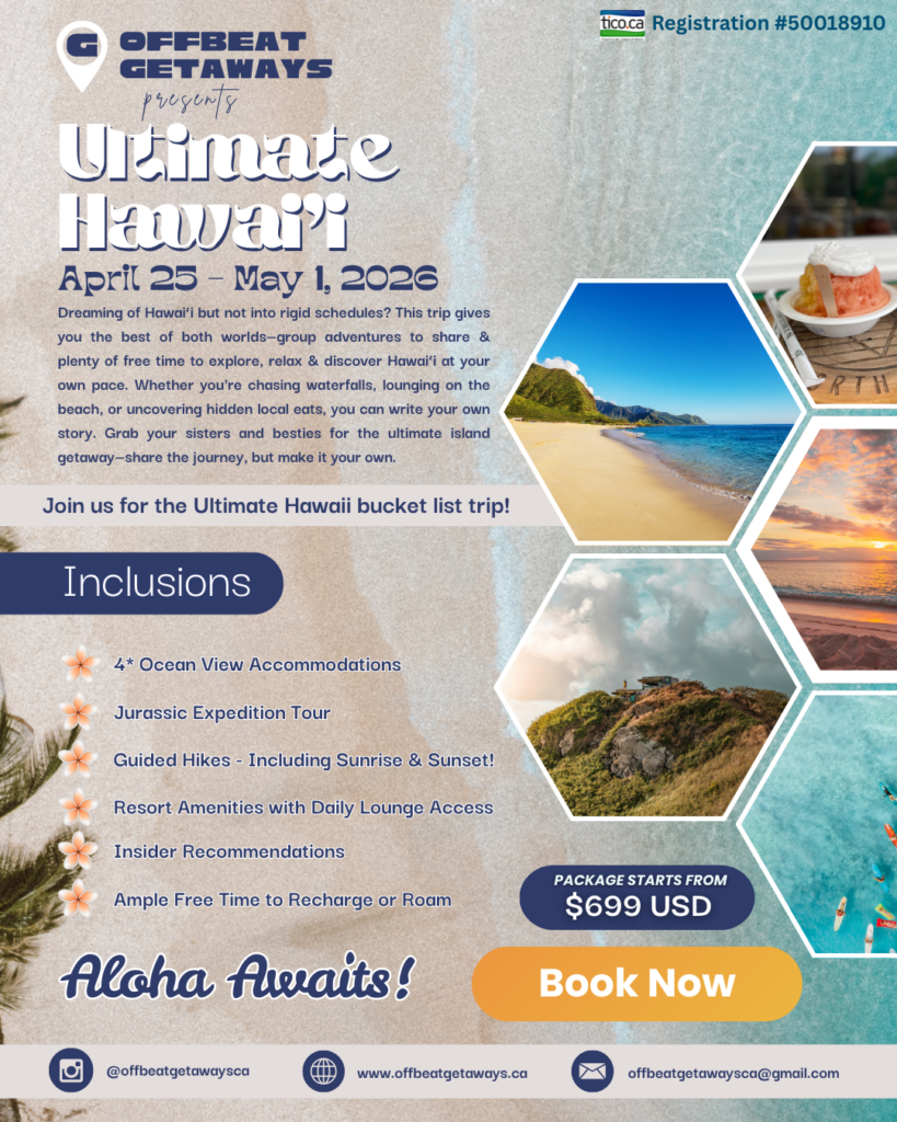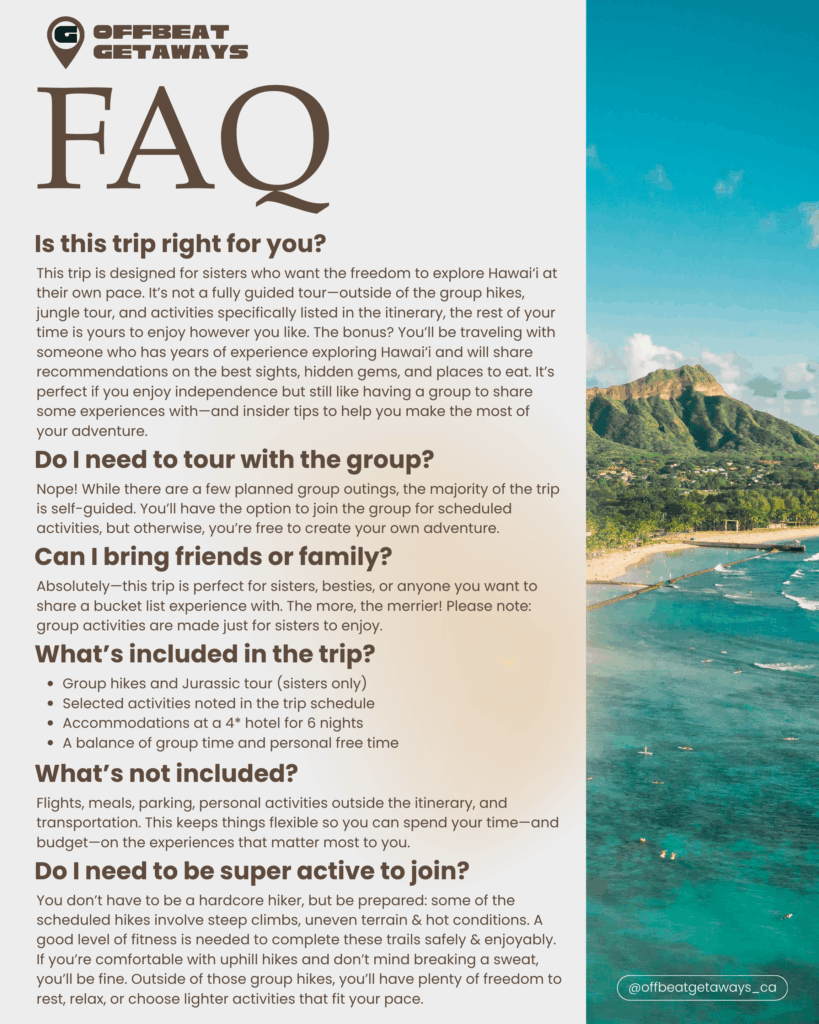 Dreaming of Hawai‘i but not into rigid schedules? This trip gives you the best of both worlds—group adventures to share & plenty of free time to explore, relax & discover Hawai‘i at your own pace. Whether you’re chasing waterfalls, lounging on the beach, or uncovering hidden local eats, you can write your own story. Grab your sisters and besties for the ultimate island getaway—share the journey, but make it your own.
